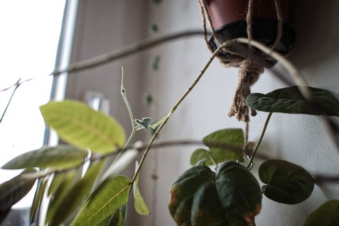Allerdings imponiert sie gerade mehr durch schnellen Wachstumsfortschritt und ihre langen, spiralförmigen Ranken. Hier zieht sich die leloja gerade an den Trieben einer Phyllanthus mirabilis hoch.