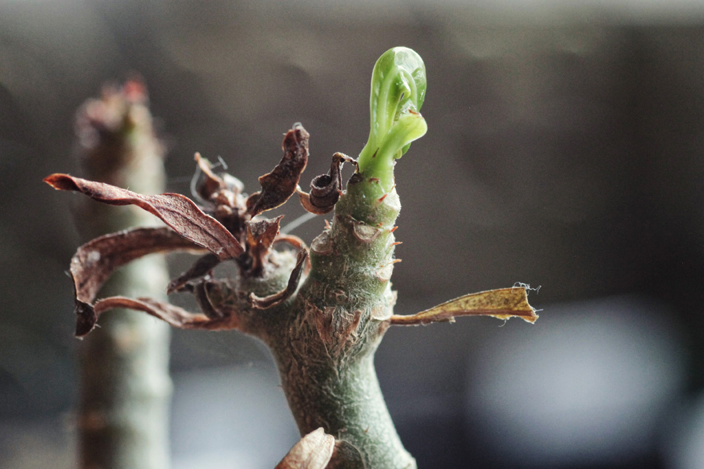 Adenium obesum. Neuaustrieb neben abgetrockneten Blättern.