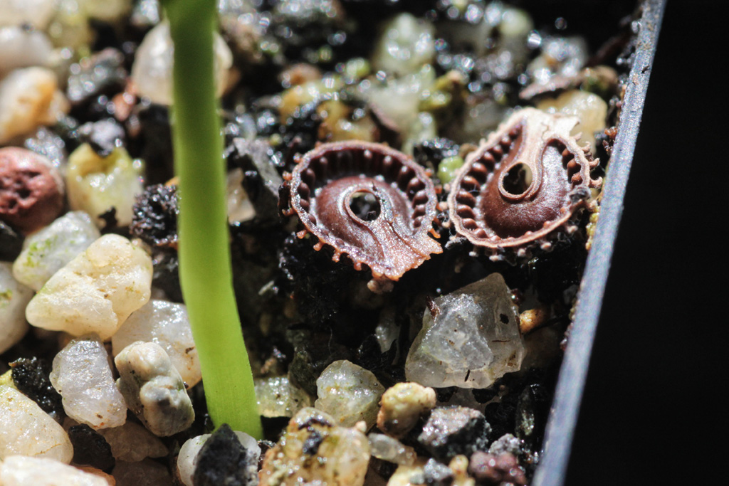 2018_09_Stephania_pierrei_03 Eine Stephania pierrei keimt und wirft das Samengehäuse ab. Stephania-Samen sind übrigens megahübsch.