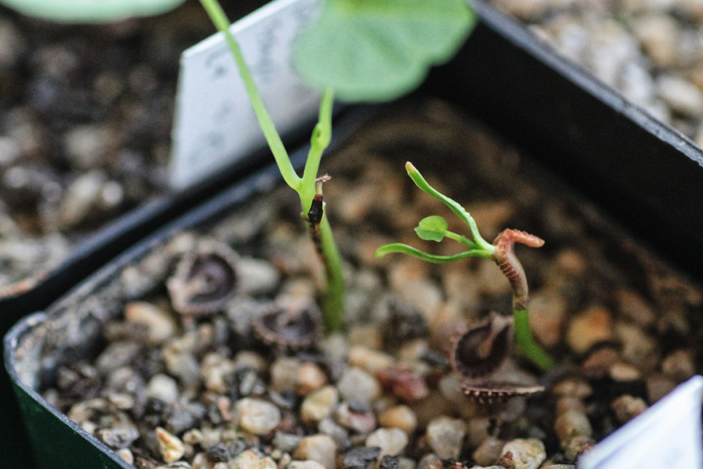 Ein zweiter Samen ist gekeimt und wirft tänzelnd die Samenhülle ab.